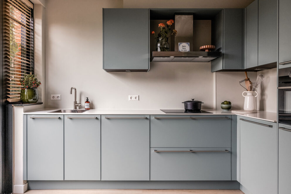 Een ander opvallend kenmerk van de keuken is het composieten werkblad van 12 mm dikte. Dit dunne, maar duurzame oppervlak in de kleur Easy White straalt luxe uit en vormt een prachtig contrast met de frisse “aqua” kleur van de kasten. De spoelbak is vlak ingefreesd in het werkblad, waardoor een naadloos en strak geheel ontstaat.
